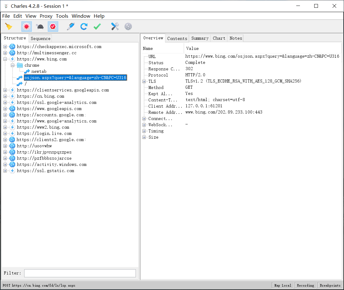 证书安装完成后 ,打开浏览器,同时观察 Charles 窗口的变化。就会发现,Charles 上会出现许多网络封包。
