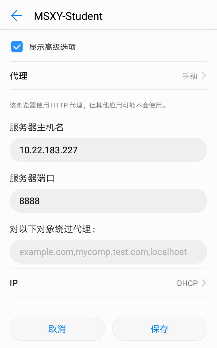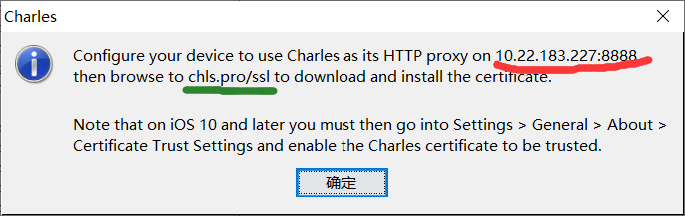 其中画红线的表示代理服务器的 IP 地址,“8888” 表示端口号,画绿线的表示下载证书的网址。