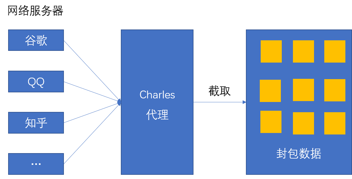 Charles 就可以充当一个代理服务器,当有访问某个站点时,客户端就会向服务器发送请求,而 Charles 可以作为代理将请求发给服务器,服务器返回的数据也会被 Charles 截取。
