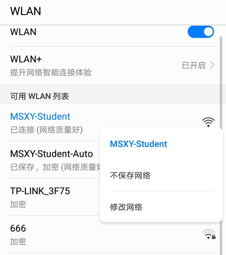 保证电脑和手机连的是同一个局域网或 WiFi。打开手机的 WLAN 设置界面,在 华为手机中,长按连接中的 WiFi 信号,会显示 “不保存网络” 和 “修改网络” 两个选项,选择 “修改网络”。